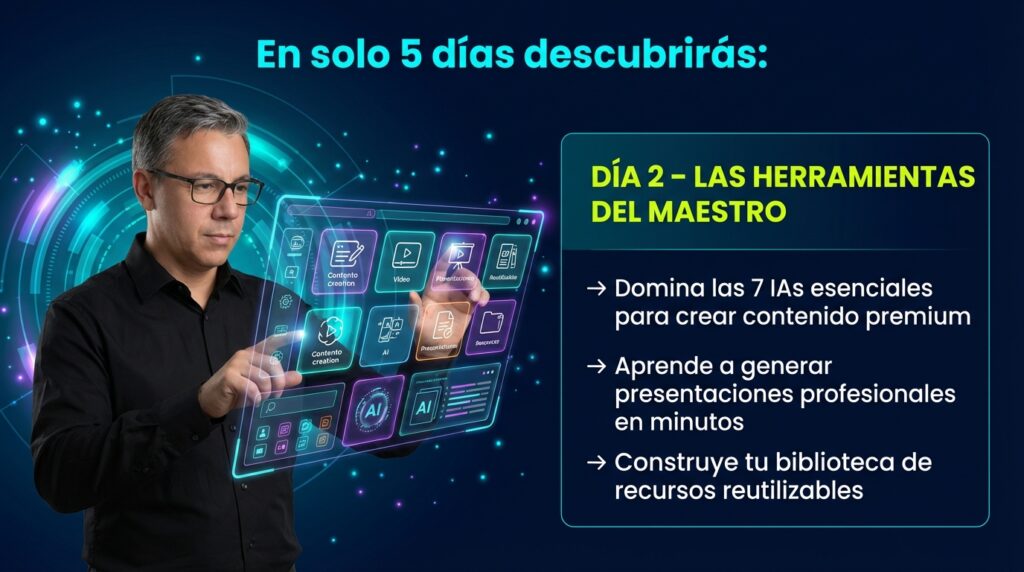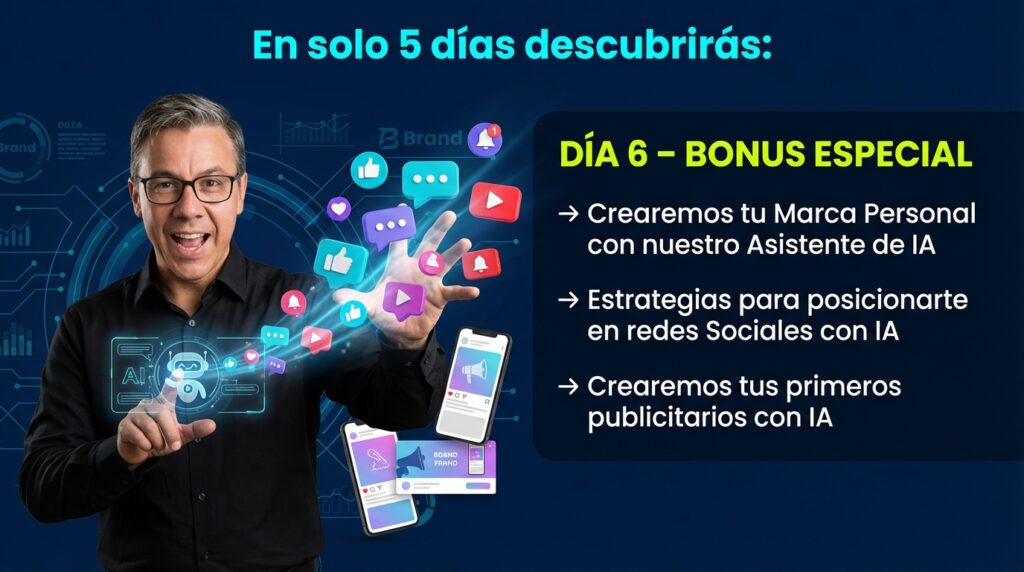 5 sesiones en vivo de 90 minutos Acceso a todas las grabaciones MI Automatizador de prompts profesionales para crear contenido 25 templates de presentaciones corporativas MI Automatizador Calculadora de precios para servicios de IA Propuestas comerciales listas para usar Plan personalizado de 90 días Acceso al grupo privado de la comunidad